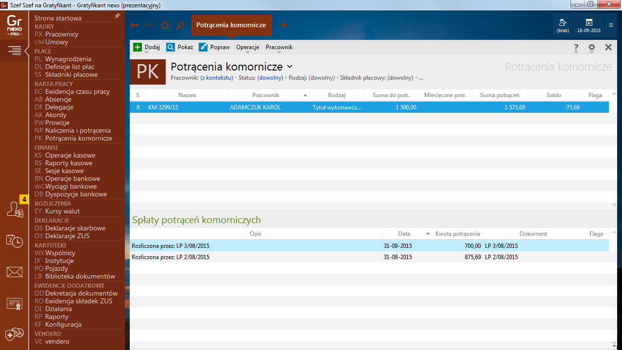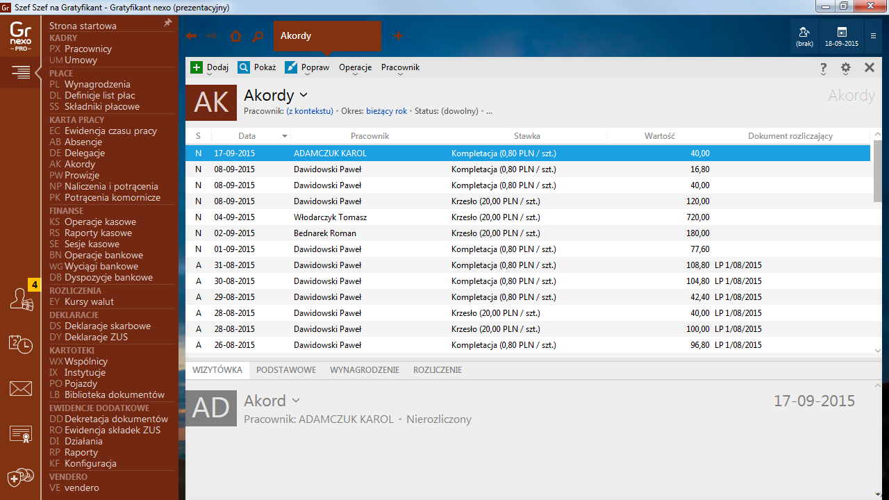 – rozliczanie ewidencji czasu pracy, akordów, prowizji, potrąceń komorniczych;