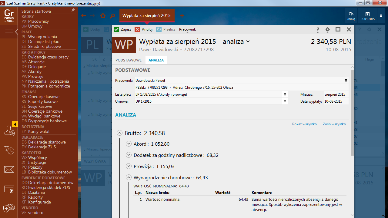 – analizator wypłaty – szczegółowy opis obliczeń poszczególnych wartości wypłaty;