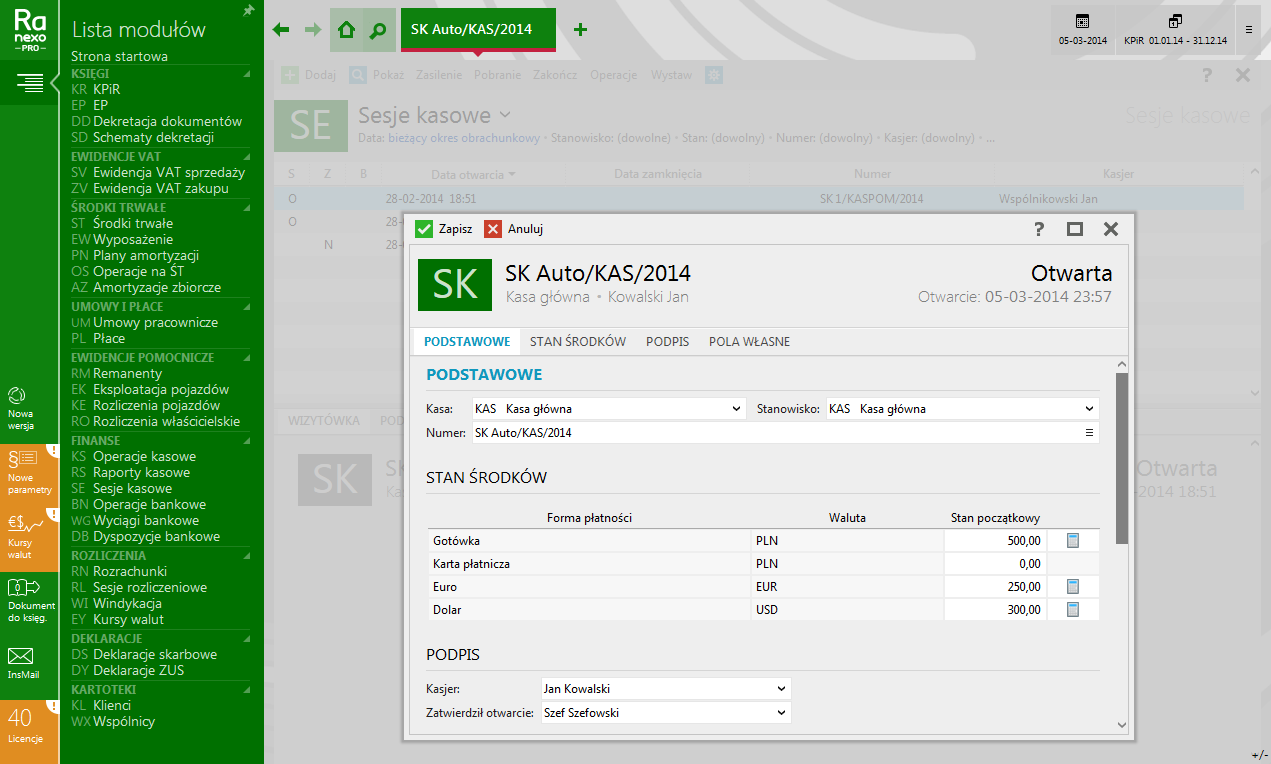 - sesje kasowe – narzędzie do weryfikacji pracy kasjera (w momencie zamykania sesji pogram sam wylicza, czy stan środków pieniężnych jest zgodny z operacjami zarejestrowanymi w systemie);