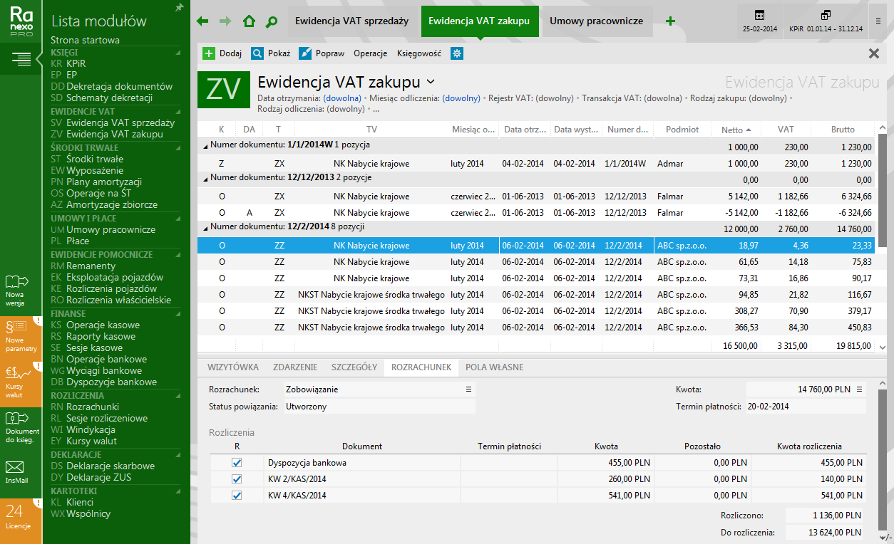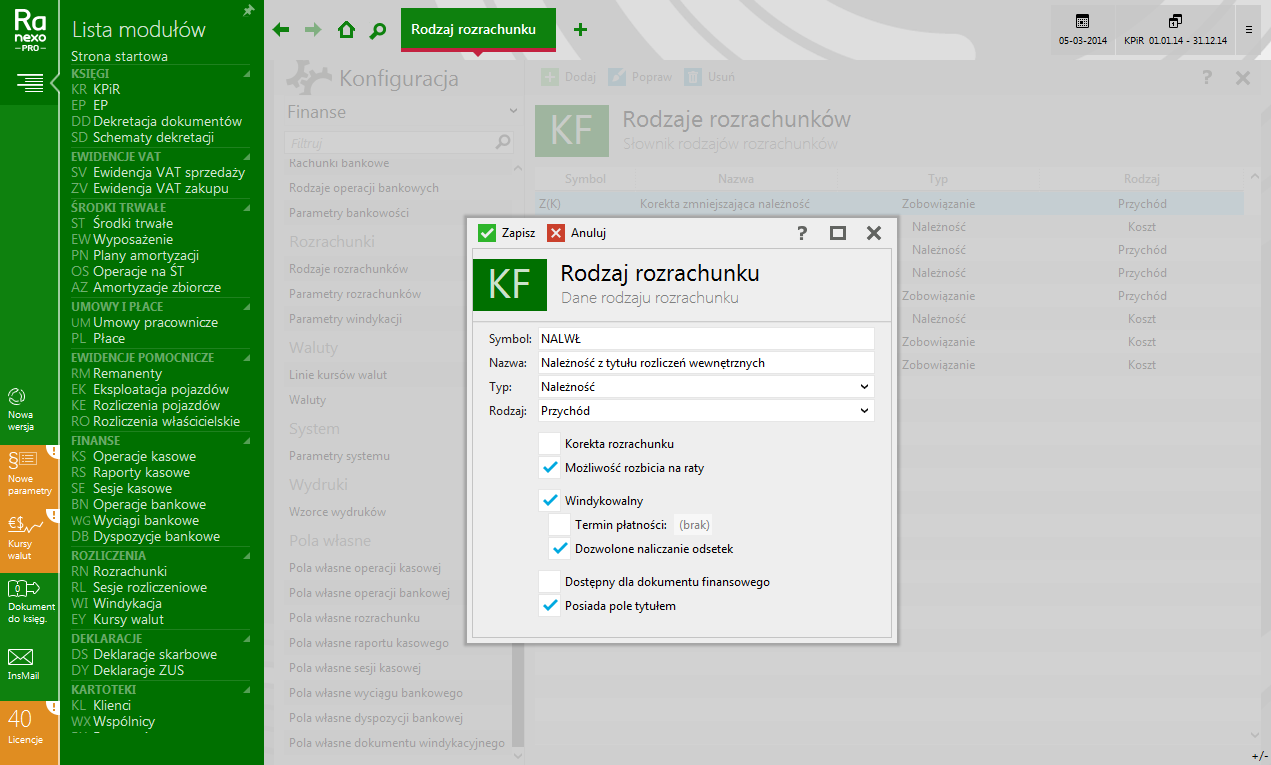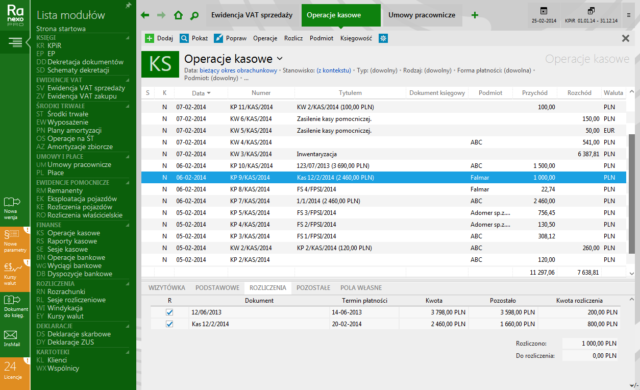- ewidencja i rozliczanie rozrachunków, naliczanie różnic kursowych, integracja z zapisami księgowymi KPiR bądź EP oraz z zapisami VAT;