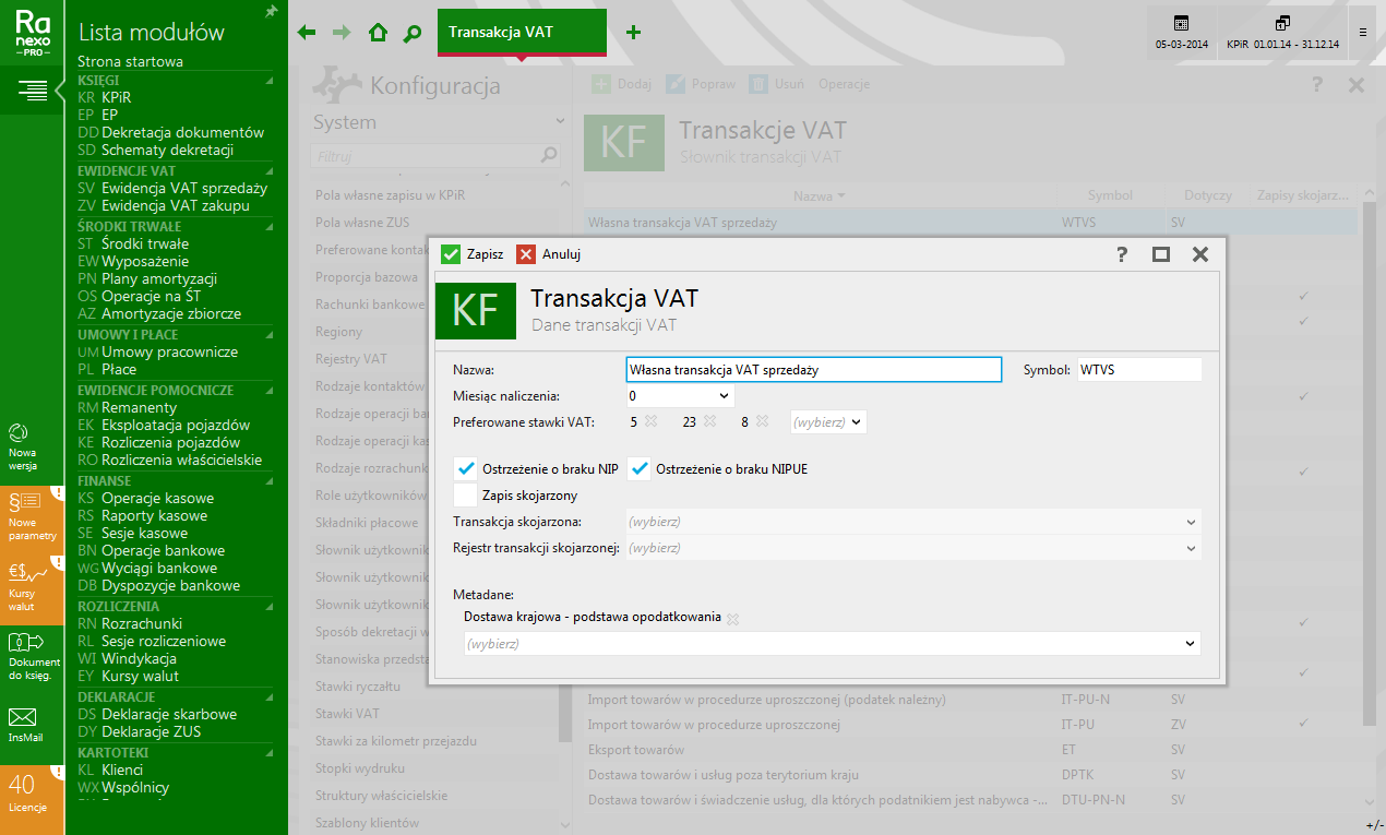 - ewidencja i rozliczanie ewidencji VAT: zakupów, sprzedaży (w tym sprzedaż marża), rozliczenia metodą kasową, korekty VAT nieterminowych płatności z możliwością tworzenia zapisów na podstawie JPK_VAT;