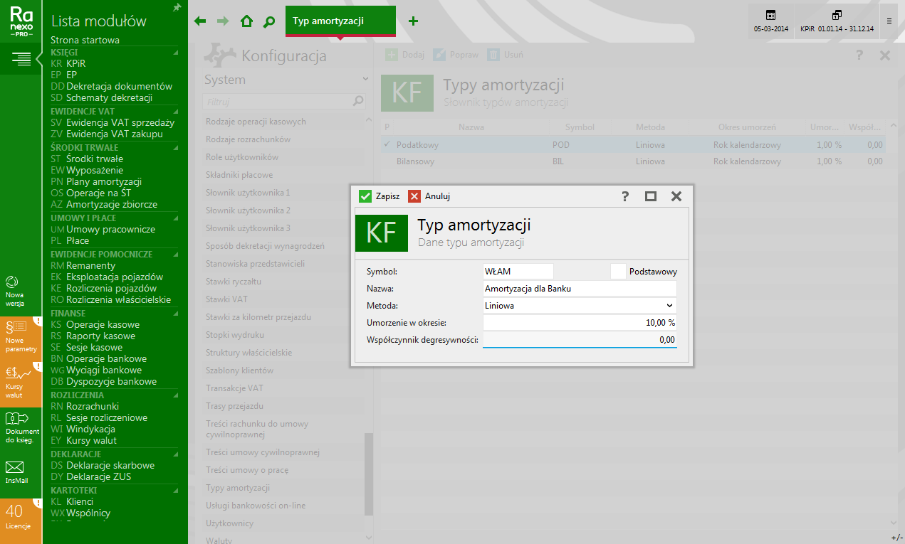 - ewidencja środków trwałych oraz wartości niematerialnych i prawnych (naliczanie i dekretacja amortyzacji z uwzględnieniem kosztów przypadających na miejsca użytkowania, wydruk tabeli i planów amortyzacji), a także ewidencji wyposażenia i remanentów;
