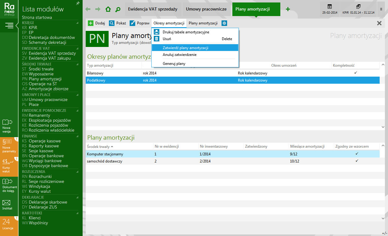 - ewidencja środków trwałych oraz wartości niematerialnych i prawnych (naliczanie i dekretacja amortyzacji z uwzględnieniem kosztów przypadających na miejsca użytkowania, wydruk tabeli i planów amortyzacji), a także ewidencja wyposażenia i remanentów;